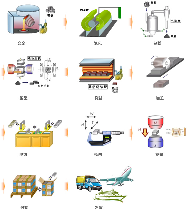 天勤磁業(yè)致力于釹鐵硼生產(chǎn)工藝的研發(fā)和改進,從而保障公司所生產(chǎn)的產(chǎn)品質(zhì)量及一致性,下圖為釹鐵硼生產(chǎn)工藝的示意圖: