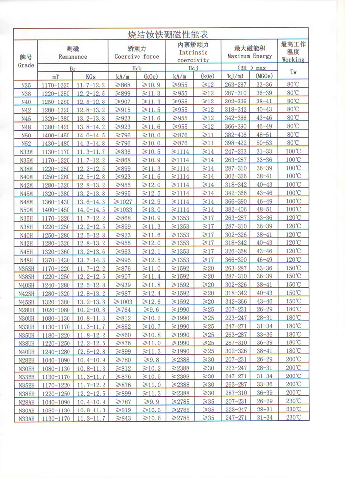 下圖為釹鐵硼的牌號示意圖,此表格依據(jù)國標(biāo)把釹鐵硼分類成不同的性能牌號,從N35至N52磁性能逐級增加,從N、M、H、SH、UH、EH、AH耐溫能力也逐級增加。